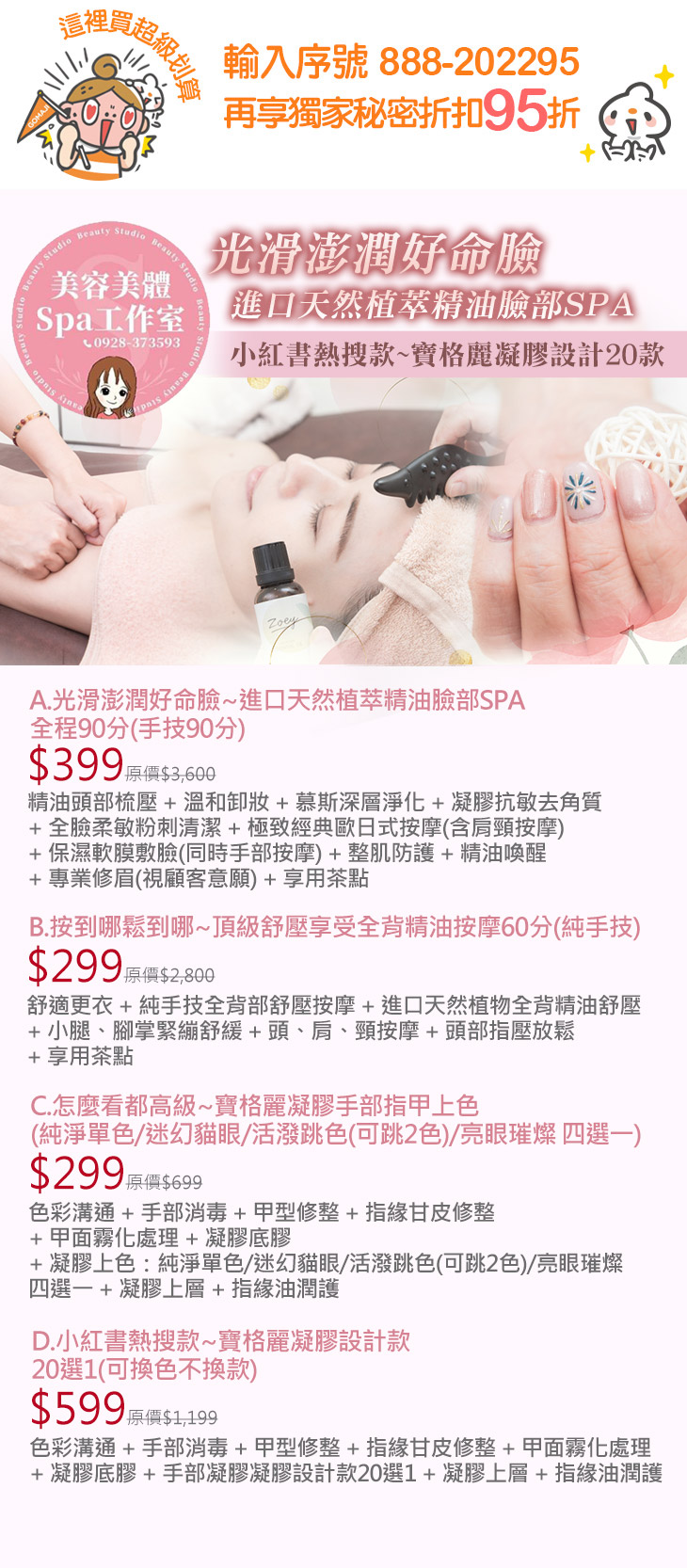 A.光滑澎潤好命臉~進口天然植萃精油臉部SPA全程90分(手技90分) / B.按到哪鬆到哪~頂級舒壓享受全背精油按摩60分(純手技) / C.怎麼看都高級~寶格麗凝膠手部指甲上色(純淨單色/迷幻貓眼/活潑跳色(可跳2色)/亮眼璀燦 四選一) / D.小紅書熱搜款~寶格麗凝膠設計款20選1(可換色不換款)