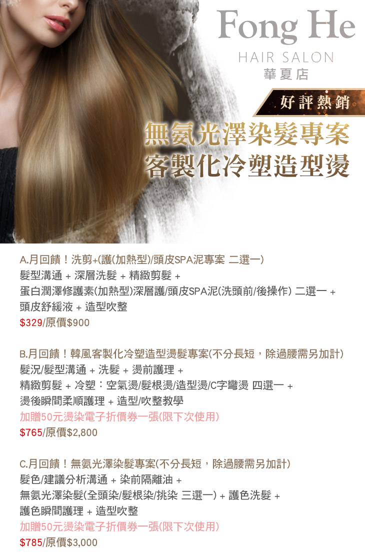 A.月回饋!洗剪+(護(加熱型)/頭皮SPA泥專案 二選一) / B.月回饋!韓風客製化冷塑造型燙髮專案(不分長短,除過腰需另加計) / C.月回饋!無氨光澤染髮專案(不分長短,除過腰需另加計)