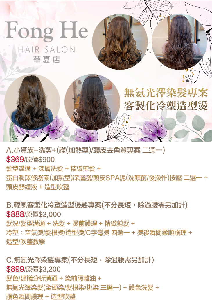 A.小資族-洗剪+(護(加熱型)/頭皮去角質專案 二選一) / B.韓風客製化冷塑造型燙髮專案(不分長短,除過腰需另加計) / C.無氨光澤染髮專案(不分長短,除過腰需另加計)