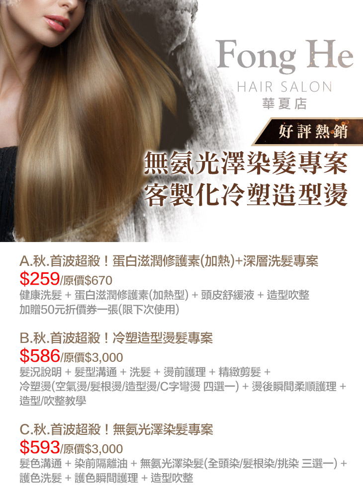 A.秋.首波超殺!蛋白滋潤修護素(加熱)+深層洗髮專案 / B.秋.首波超殺!冷塑造型燙髮專案 / C.秋.首波超殺!無氨光澤染髮專案