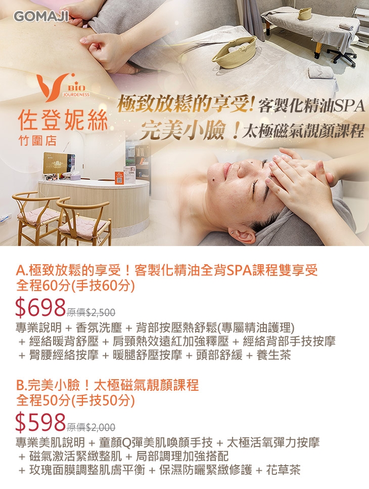 A.極致放鬆的享受!客製化精油全背SPA課程雙享受全程60分(手技60分) / B.完美小臉!太極磁氣靚顏課程全程50分(手技50分)