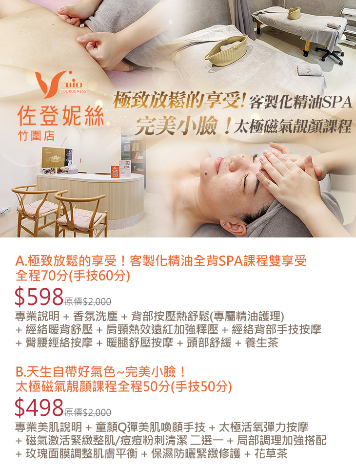 A.極致放鬆的享受!客製化精油全背SPA課程雙享受全程60分(手技60分) / B.天生自帶好氣色~完美小臉!太極磁氣靚顏課程全程50分(手技50分)