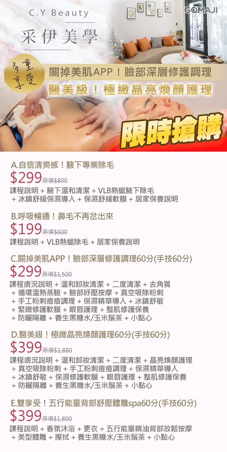 A.自信清爽感!腋下專業除毛 / B.呼吸暢通!鼻毛不再岔出來 / C.關掉美肌APP!臉部深層修護調理60分(手技60分) / D.醫美級!極緻晶亮煥顏護理60分(手技60分) / E.雙享受!五行能量背部舒壓體雕spa60分(手技60分)