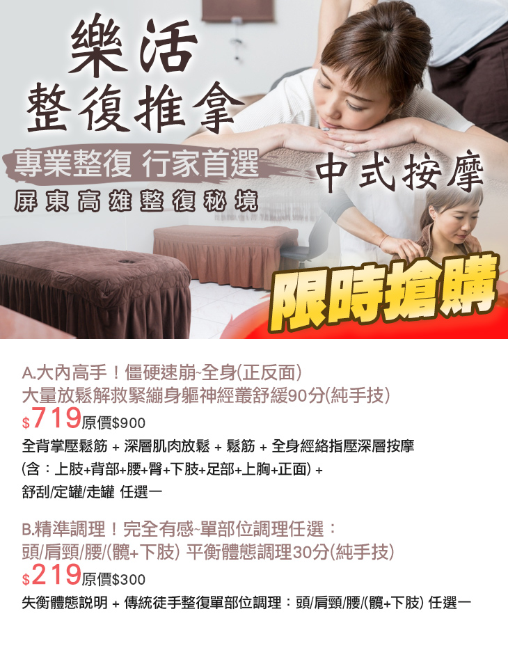 A.大內高手!僵硬速崩~全身(正反面)大量放鬆解救緊繃身軀神經叢舒緩90分(純手技) / B.精準調理!完全有感~單部位調理任選:頭/肩頸/腰/(髖+下肢) 平衡體態調理30分(純手技)