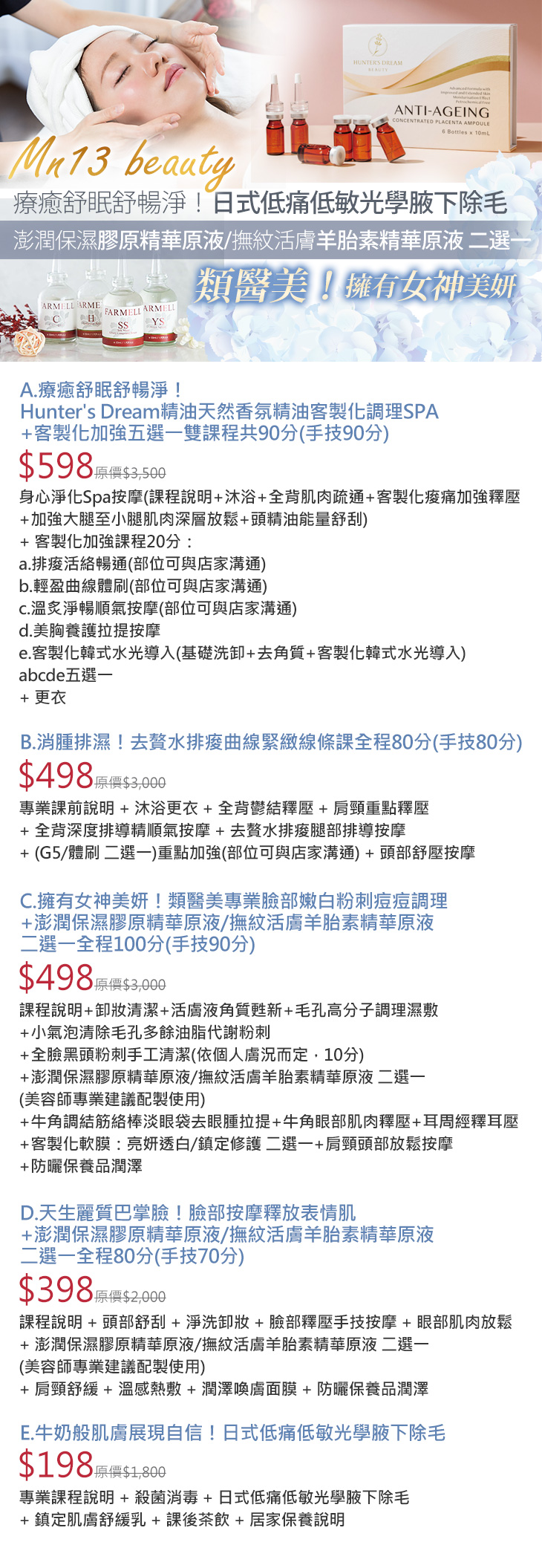 A.Hunter's Dream精油天然香氛精油客製化調理SPA+客製化加強五選一雙課程共90分(手技90分)/B.消腫排濕!去贅水排痠曲線緊緻線條課全程80分(手技80分)/C.類醫美專業臉部嫩白粉刺痘痘調理+澎潤保濕膠原精華原液/撫紋活膚羊胎素精華原液 二選一全程100分(手技90分)/D.天生麗質巴掌臉!臉部按摩釋放表情肌+澎潤保濕膠原精華原液/撫紋活膚羊胎素精華原液 二選一全程80分(手技70分)/E.牛奶般肌膚展現自信!日式低痛低敏光學腋下除毛