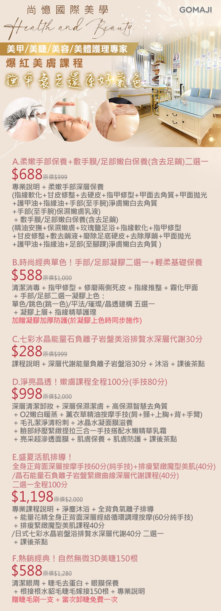 A.柔嫰手部保養+敷手膜/足部嫩白保養(含去足繭)二選一 / B.時尚經典單色!手部/足部凝膠二選一+輕柔基礎保養 / C.七彩水晶能量石負離子岩盤美浴排贅水深層代謝30分 / D.淨亮晶透!嫰膚課程全程100分(手技80分) / E.盛夏活肌排導!全身正背面深層按摩手技60分(純手技)+排痠緊緻魔型美肌(40分)/晶石能量石負離子岩盤緊緻曲線深層代謝課程(40分)二選一全程100分 / F.熱銷經典!自然無微3D美睫150根