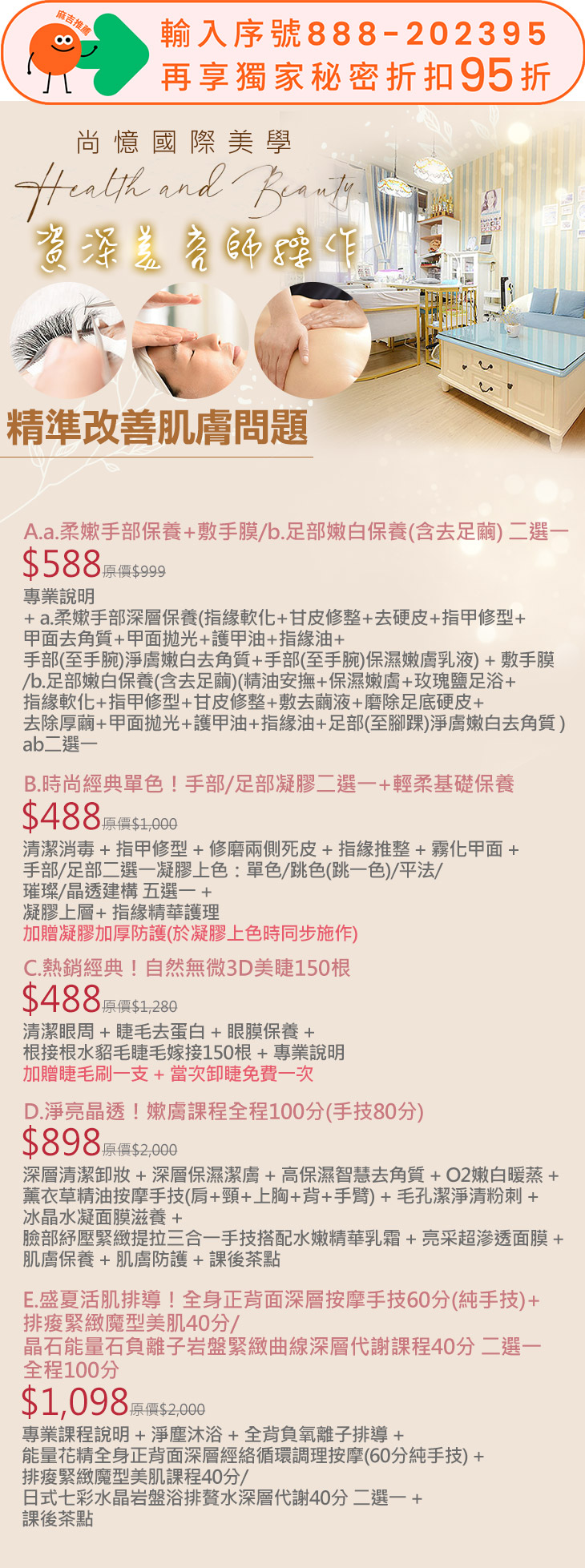A.a.柔嫰手部保養+敷手膜/b.足部嫩白保養(含去足繭) 二選一 / B.時尚經典單色!手部/足部凝膠二選一+輕柔基礎保養 / C.熱銷經典!自然無微3D美睫150根 / D.淨亮晶透!嫰膚課程全程100分(手技80分) / E.盛夏活肌排導!全身正背面深層按摩手技60分(純手技)+排痠緊緻魔型美肌40分/晶石能量石負離子岩盤緊緻曲線深層代謝課程40分 二選一全程100分