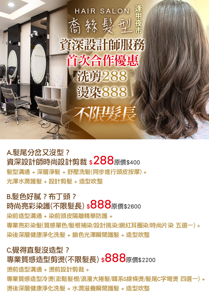 A.髮尾分岔又沒型?資深設計師時尚設計剪裁 / B.髮色好膩?布丁頭?時尚亮彩染護(不限髮長) / C.覺得直髮沒造型?專業質感造型剪燙(不限髮長)