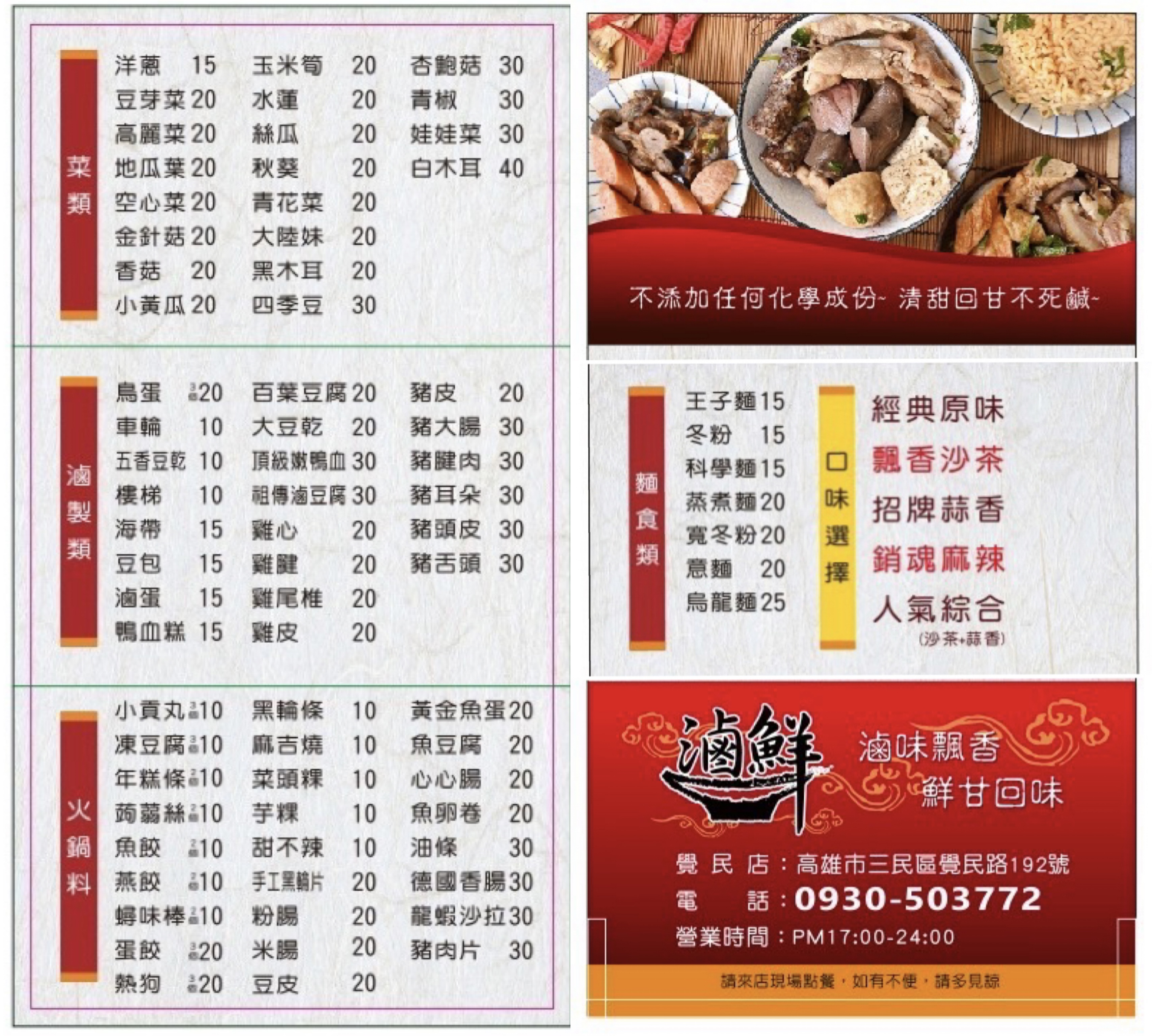 豆乾、鮮肉、鴨血、米血⋯等豐盛配料於獨門滷汁中慢慢滷製入味,不添加化學調味的滷香,清甜、回甘、不死鹹,有著藥膳獨特的香氣,將所有食材滷得香氣四溢、口感升級,讓您一次品味到各有千秋的甘醇美味!
