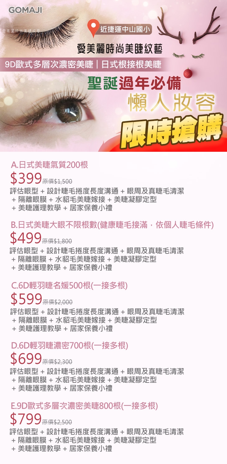 A.日式美睫氣質200根 / B.日式美睫大眼不限根數(健康睫毛接滿,依個人睫毛條件) / C.6D輕羽睫名媛500根(一接多根) / D.6D輕羽睫濃密700根(一接多根) / E.9D歐式多層次濃密美睫800根(一接多根)
