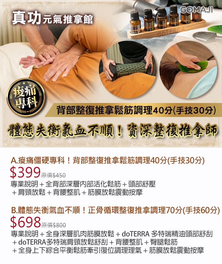 A.痠痛僵硬專科!背部整復推拿鬆筋調理40分(手技30分)