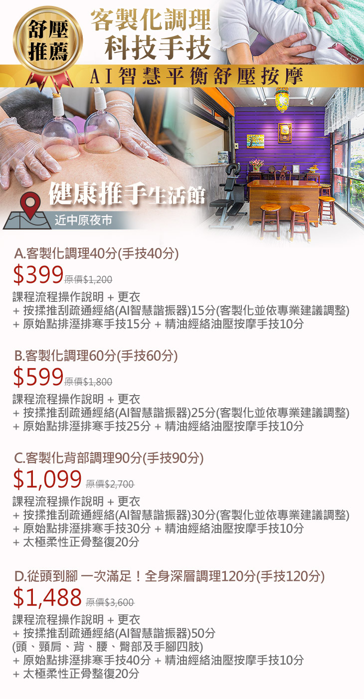 〈課程流程操作說明 + 更衣 + 按揉推刮疏通經絡(AI智慧諧振器)50分(頭、頸肩、背、腰、臀部及手腳四肢) + 原始點排溼排寒手技40分 + 精油經絡油壓按摩手技10分 + 太極柔性正骨整復20分〉