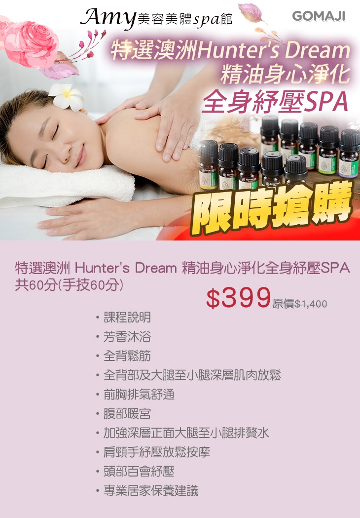 特選澳洲Hunter's Dream精油身心淨化全身紓壓SPA共60分(手技60分)