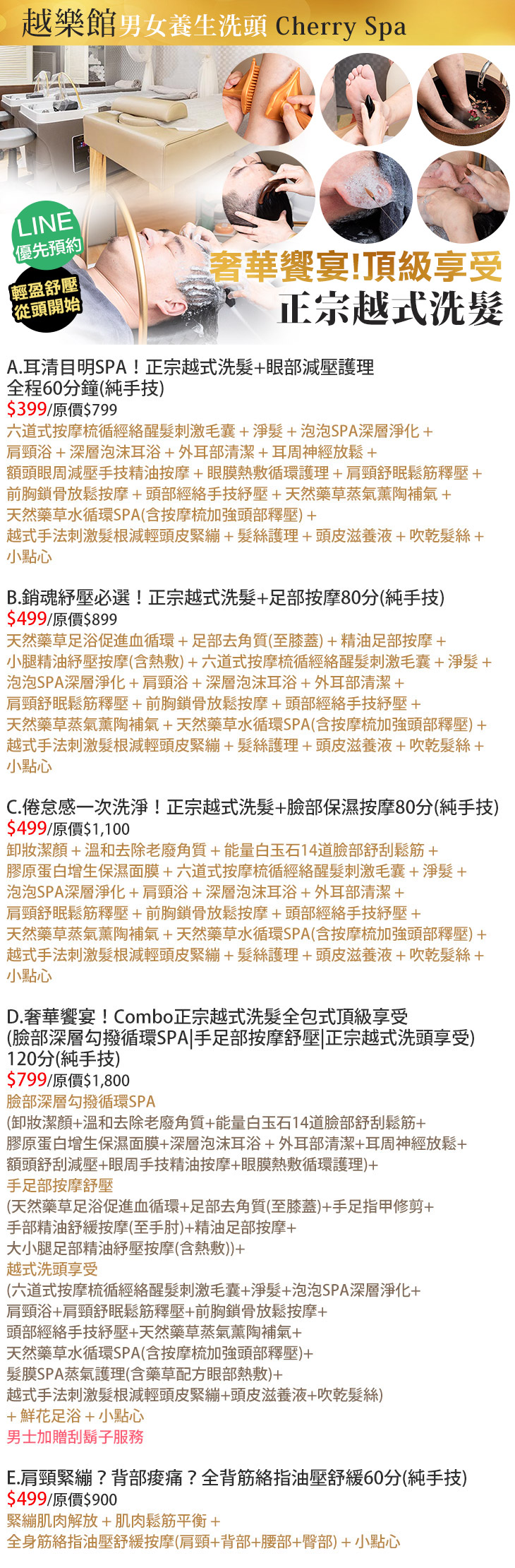 A.耳清目明SPA!正宗越式洗髮+眼部減壓護理全程60分鐘(純手技) / B.銷魂紓壓必選!正宗越式洗髮+足部按摩80分(純手技) / C.倦怠感一次洗淨!正宗越式洗髮+臉部保濕按摩80分(純手技) / D.奢華饗宴!Combo正宗越式洗髮全包式頂級享受(臉部深層勾撥循環SPA|手足部按摩舒壓|正宗越式洗頭享受)120分(純手技) / E.肩頸緊繃?背部痠痛?全背筋絡指油壓舒緩60分(純手技)