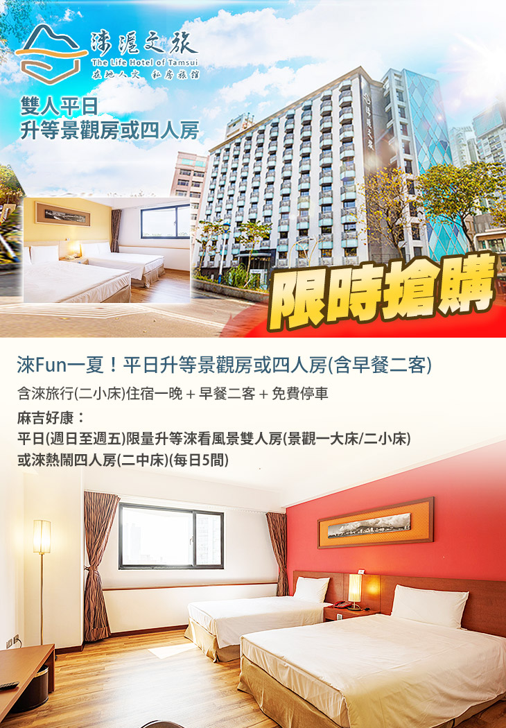 ◇雙人含早餐平日再享免費升等景觀房(河景一大床/二小床),也可以選擇淶熱鬧四人房,可彈性加人加價入住,每日限量間數,欲購從速!