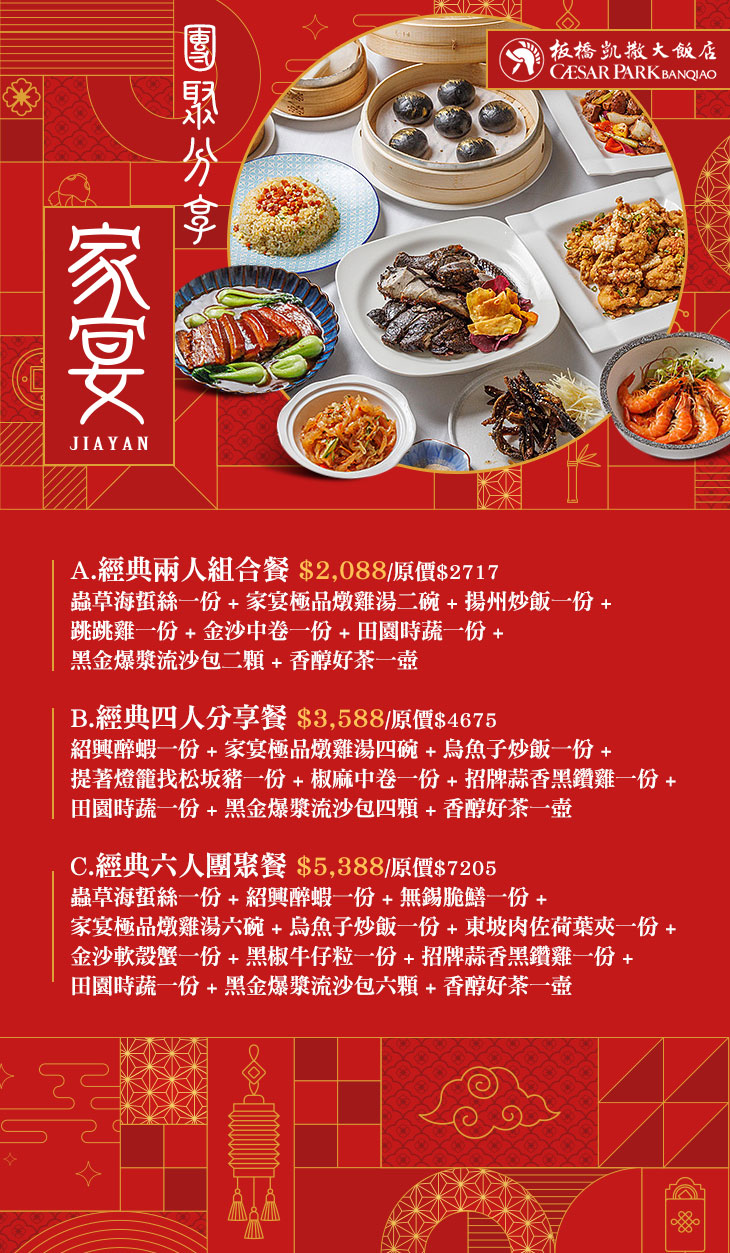 位於板橋凱撒大飯店內的「家宴」中餐廳,特別選用台灣在地新鮮食材料理出一道道家鄉味,舉凡各式開胃小菜、海鮮美饌、熱鍋快炒,以及台式點心等等,每道經典料理都是由主廚一一細心烹煮而成。希望來到這裡用餐的人,在享用美食之餘,也能夠喚起記憶裡,有關於「家鄉」的味道。