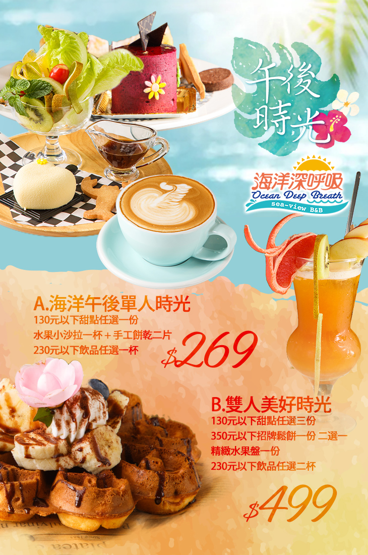 130元以下甜點任選三份/350元以下招牌鬆餅一份 二選一 + 精緻水果盤一份 + 230元以下飲品任選二杯