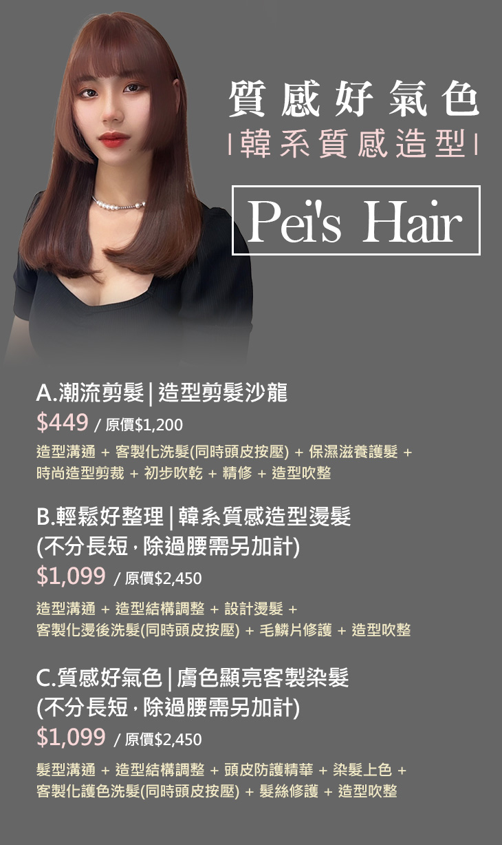 A.潮流剪髮|造型剪髮沙龍 / B.輕鬆好整理|韓系質感造型燙髮(不分長短,除過腰需另加計) / C.質感好氣色|膚色顯亮客製染髮(不分長短,除過腰需另加計)