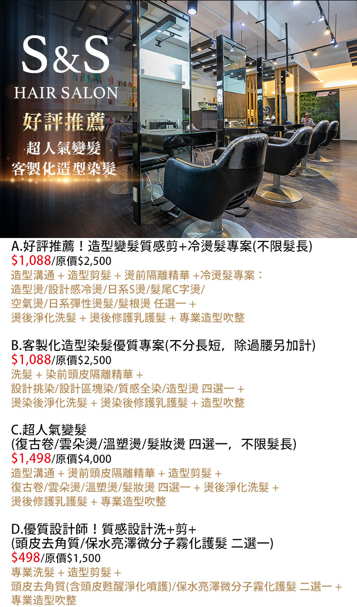 A.好評推薦!造型變髮質感剪+冷燙髮專案(不限髮長) / B.客製化造型染髮優質專案(不分長短,除過腰另加計) / C.超人氣變髮(復古卷/雲朵燙/溫塑燙/髮妝燙 四選一,不限髮長) / D.優質設計師!質感設計洗+剪+(頭皮去角質/保水亮澤微分子霧化護髮 二選一)