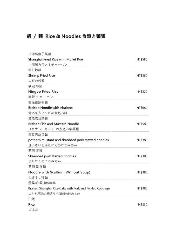 上海人愛吃黃魚與醃菜,「招牌雪菜黃魚煨麵」製作相當費工,將新鮮黃魚剃骨,湯底以煎過的魚骨、各種蔬菜、老雪菜慢燉十小時成乳白色上湯,讓整體甜味、鮮味釋放出來,再放上煎至酥香的黃魚片,魚肉口感細嫩,鹹中帶甜的湯底,搭配吸飽湯汁的細麵條、脆口雪菜,滿滿精華融入,是一碗回味無窮的好麵。