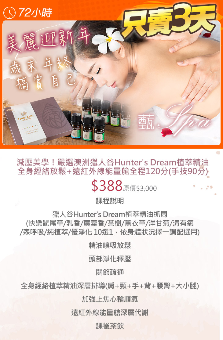〈課程說明 + 獵人谷Hunter's Dream植萃精油抓周(快樂鼠尾草/乳香/廣藿香/茶樹/薰衣草/洋甘菊/清有氧/森呼吸/純植萃/優淨化 10選1,依身體狀況擇一調配選用) + 精油嗅吸放鬆 + 頭部淨化釋壓 + 關節疏通 + 全身經絡植萃精油深層排導(肩+頸+手+背+腰臀+大小腿) + 加強上焦心輪順氣 + 遠紅外線能量艙深層代謝 + 課後茶飲〉