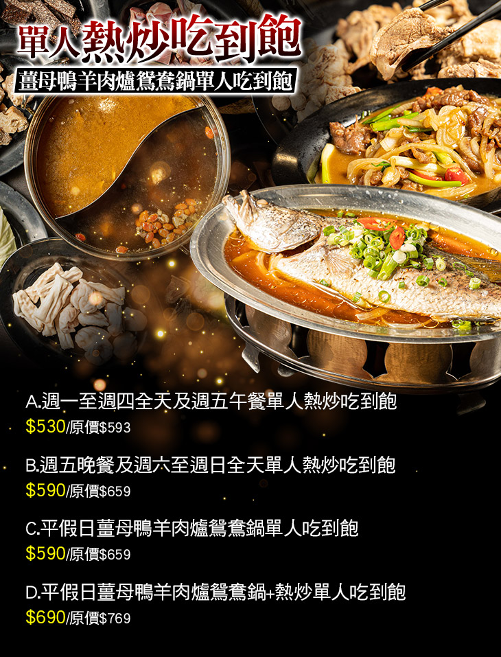 A.週一至週四全天及週五午餐單人熱炒吃到飽 / B.週五晚餐及週六至週日全天單人熱炒吃到飽 / C.平假日薑母鴨羊肉爐鴛鴦鍋單人吃到飽 / D.平假日薑母鴨羊肉爐鴛鴦鍋+熱炒單人吃到飽