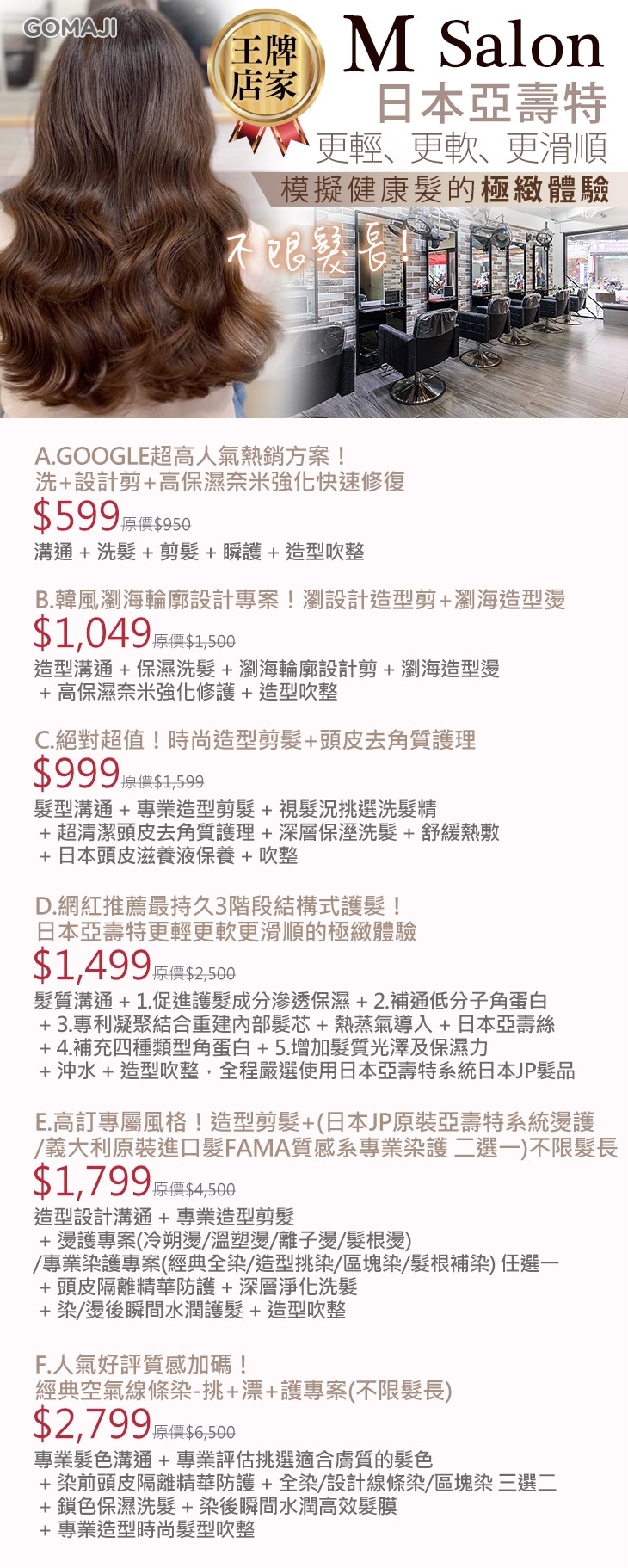 A.GOOGLE超高人氣熱銷方案!洗+設計剪+高保濕奈米強化快速修復 / B.韓風瀏海輪廓設計專案!瀏設計造型剪+瀏海造型燙 / C.絕對超值!時尚造型剪髮+頭皮去角質護理 / D.網紅推薦最持久3階段結構式護髮!日本亞壽特更輕更軟更滑順的極緻體驗 / E.高訂專屬風格!造型剪髮+(日本JP原裝亞壽特系統燙護/義大利原裝進口髮FAMA質感系專業染護 二選一)不限髮長 / F.人氣好評質感加碼!經典空氣線條染-挑+漂+護專案(不限髮長)