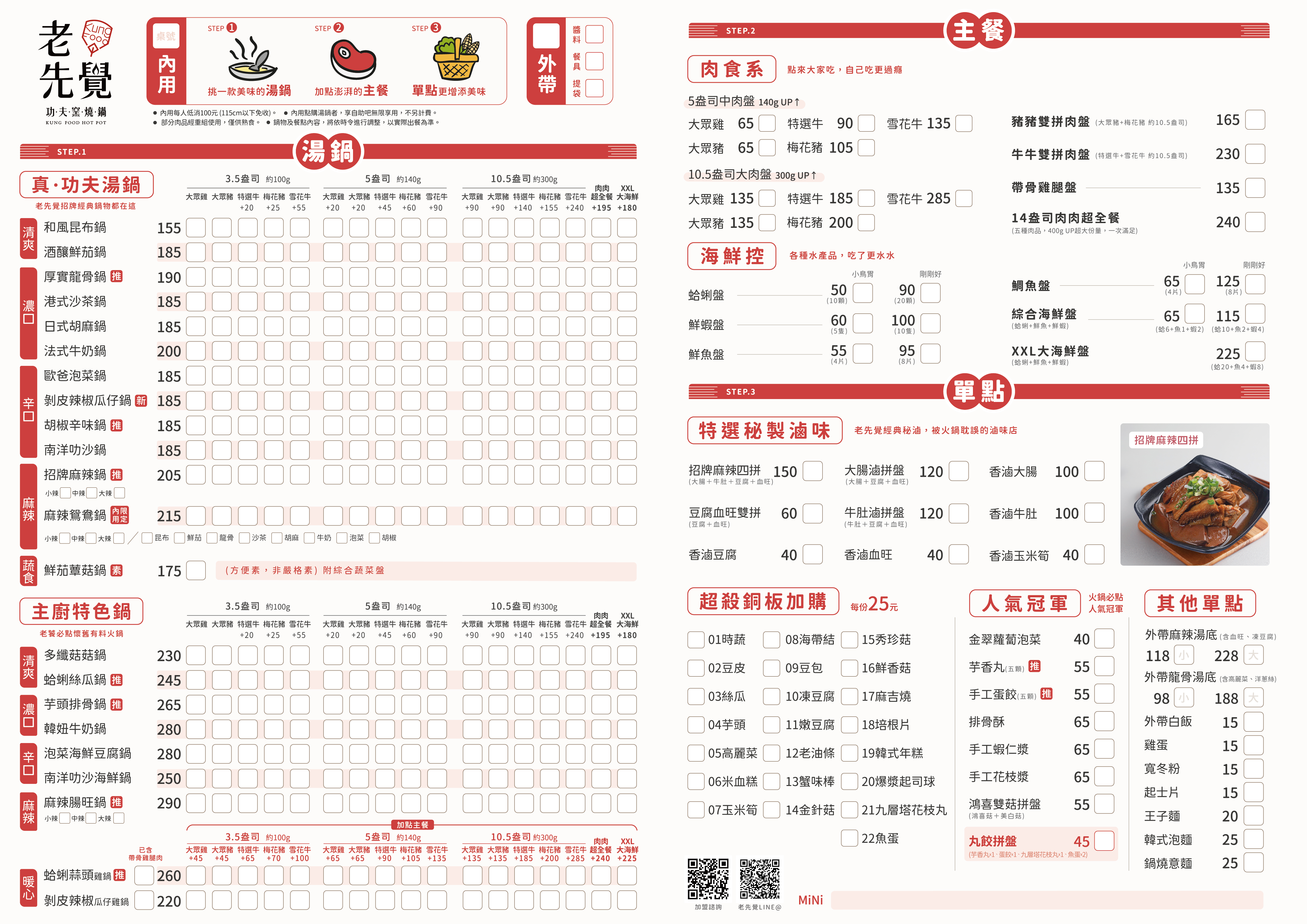 堅持以最鮮湯頭、精緻的食材,提供給顧客高CP值的火鍋料理,讓您盡情品味鍋中精華,感受滴滴鮮醇的湯汁,在舌尖散發醇香溫潤的風味,伴隨著肉品的鮮嫩多汁、時蔬的爽脆清甜,不禁愛上這絕倫一品的鍋物盛宴!吃火鍋,就首選老先覺!