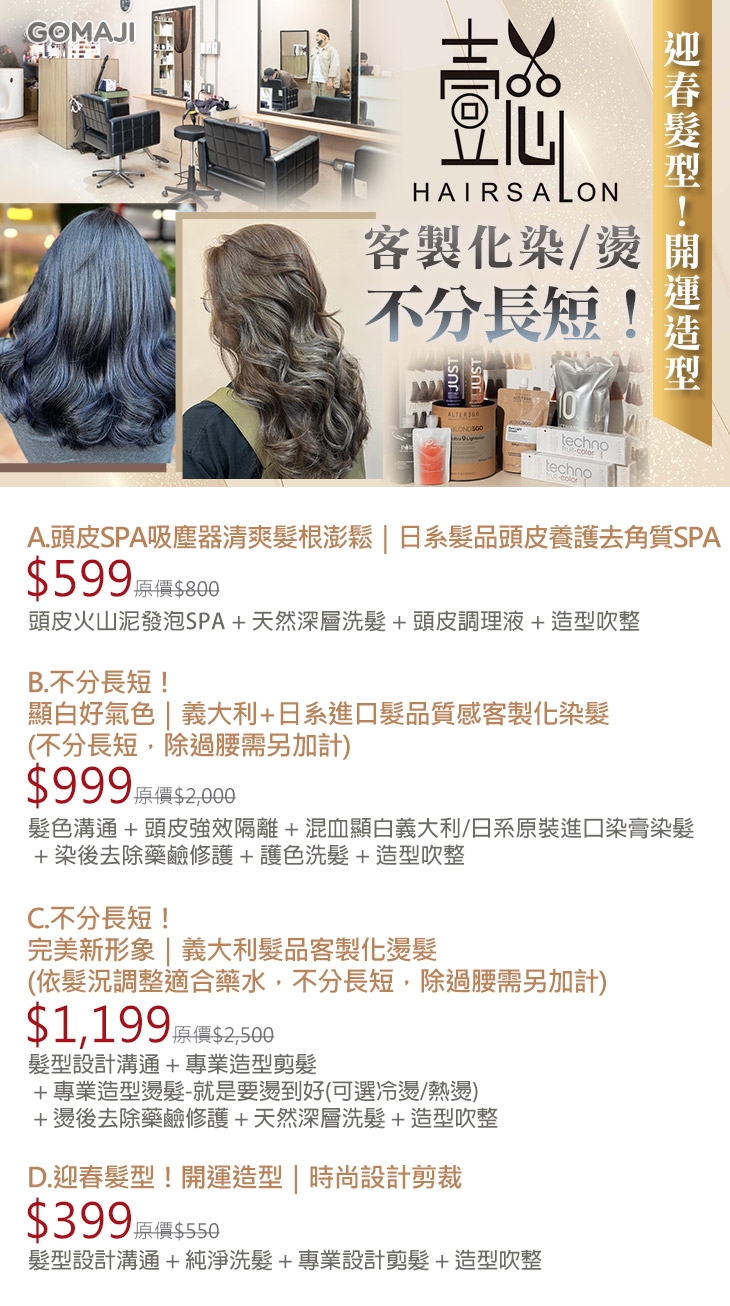 A.頭皮SPA吸塵器清爽髮根澎鬆|日系髮品頭皮養護去角質SPA / B.不分長短!顯白好氣色|義大利+日系進口髮品質感客製化染髮(不分長短,除過腰需另加計) / C.不分長短!完美新形象|義大利髮品客製化燙髮(依髮況調整適合藥水,不分長短,除過腰需另加計) / D.迎春髮型!開運造型|時尚設計剪裁