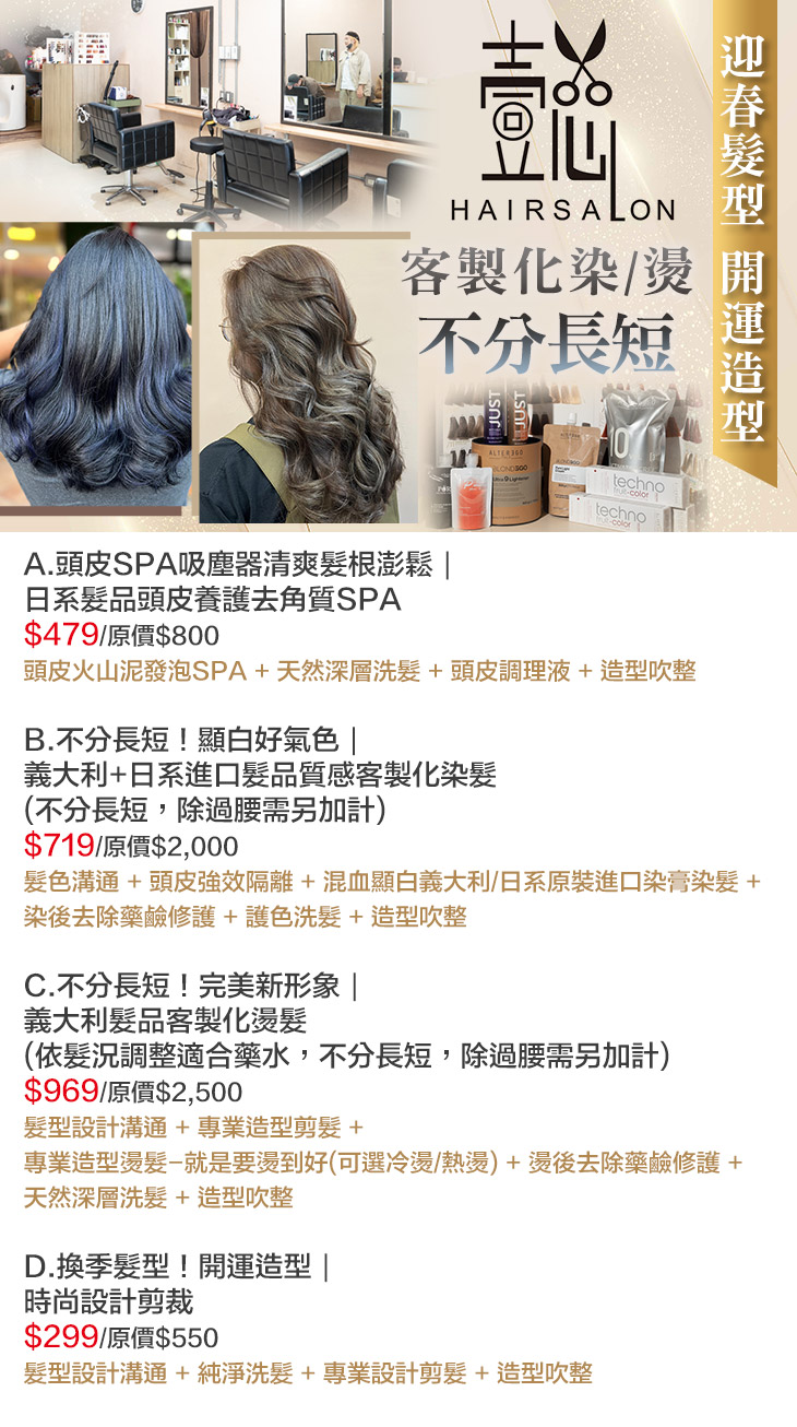 A.頭皮SPA吸塵器清爽髮根澎鬆|日系髮品頭皮養護去角質SPA / B.不分長短!顯白好氣色|義大利+日系進口髮品質感客製化染髮(不分長短,除過腰需另加計) / C.不分長短!完美新形象|義大利髮品客製化燙髮(依髮況調整適合藥水,不分長短,除過腰需另加計) / D.換季髮型!開運造型|時尚設計剪裁