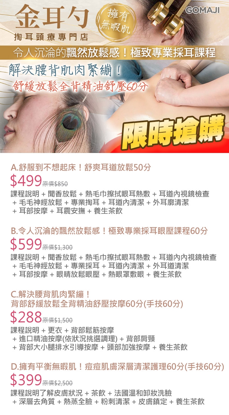 A.舒服到不想起床!舒爽耳道放鬆50分 / B.令人沉淪的飄然放鬆感!極致專業採耳眼壓課程60分 / C.解決腰背肌肉緊繃!背部舒緩放鬆全背精油舒壓按摩60分(手技60分) / D.擁有平衡無暇肌!痘痘肌膚深層清潔護理60分(手技60分)
