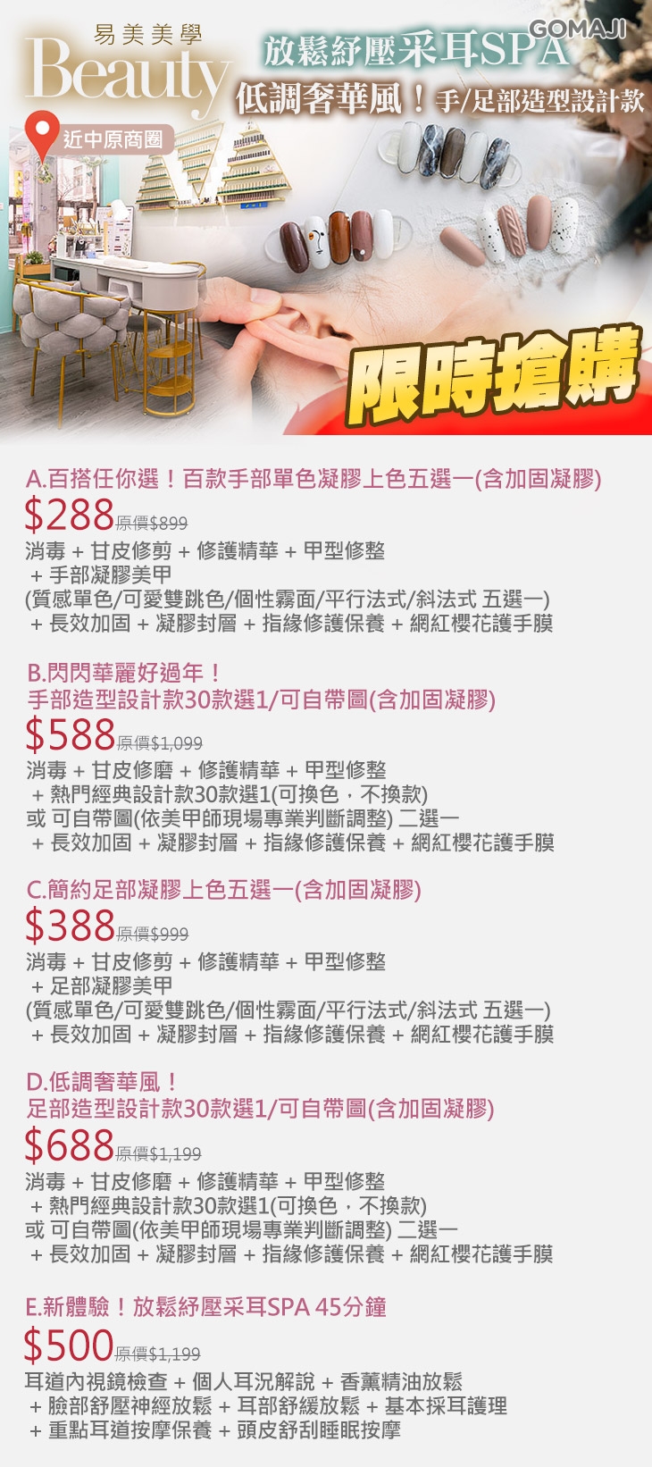 A.百搭任你選!百款手部單色凝膠上色五選一(含加固凝膠) / B.閃閃華麗好過年!手部造型設計款30款選1/可自帶圖(含加固凝膠) / C.簡約足部凝膠上色五選一(含加固凝膠) / D.低調奢華風!足部造型設計款30款選1/可自帶圖(含加固凝膠) / E.新體驗!放鬆紓壓采耳SPA 45分鐘