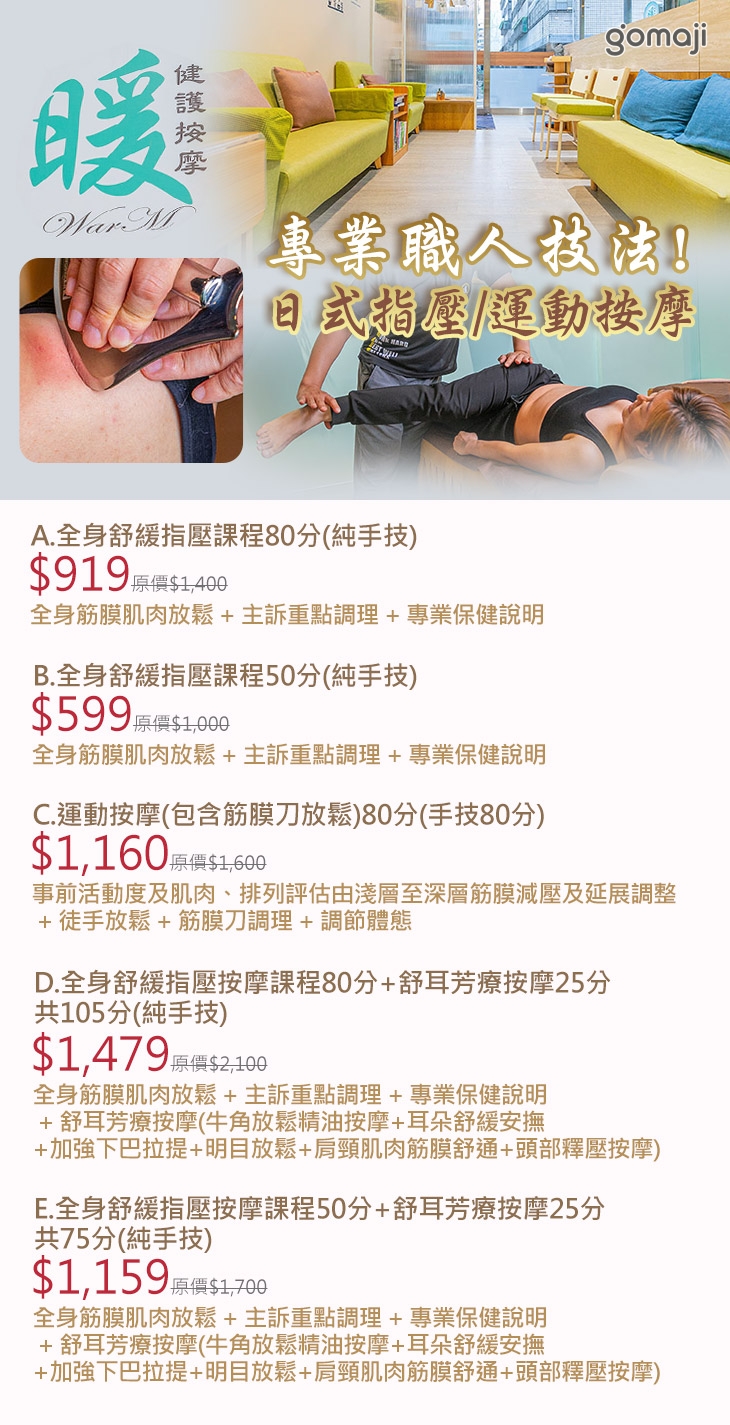 A.全身舒緩指壓課程80分(純手技) / B.全身舒緩指壓課程50分(純手技) / C.運動按摩(包含筋膜刀放鬆)80分(手技80分) / D.全身舒緩指壓按摩課程80分+舒耳芳療按摩25分共105分(純手技) / E.全身舒緩指壓按摩課程50分+舒耳芳療按摩25分共75分(純手技)
