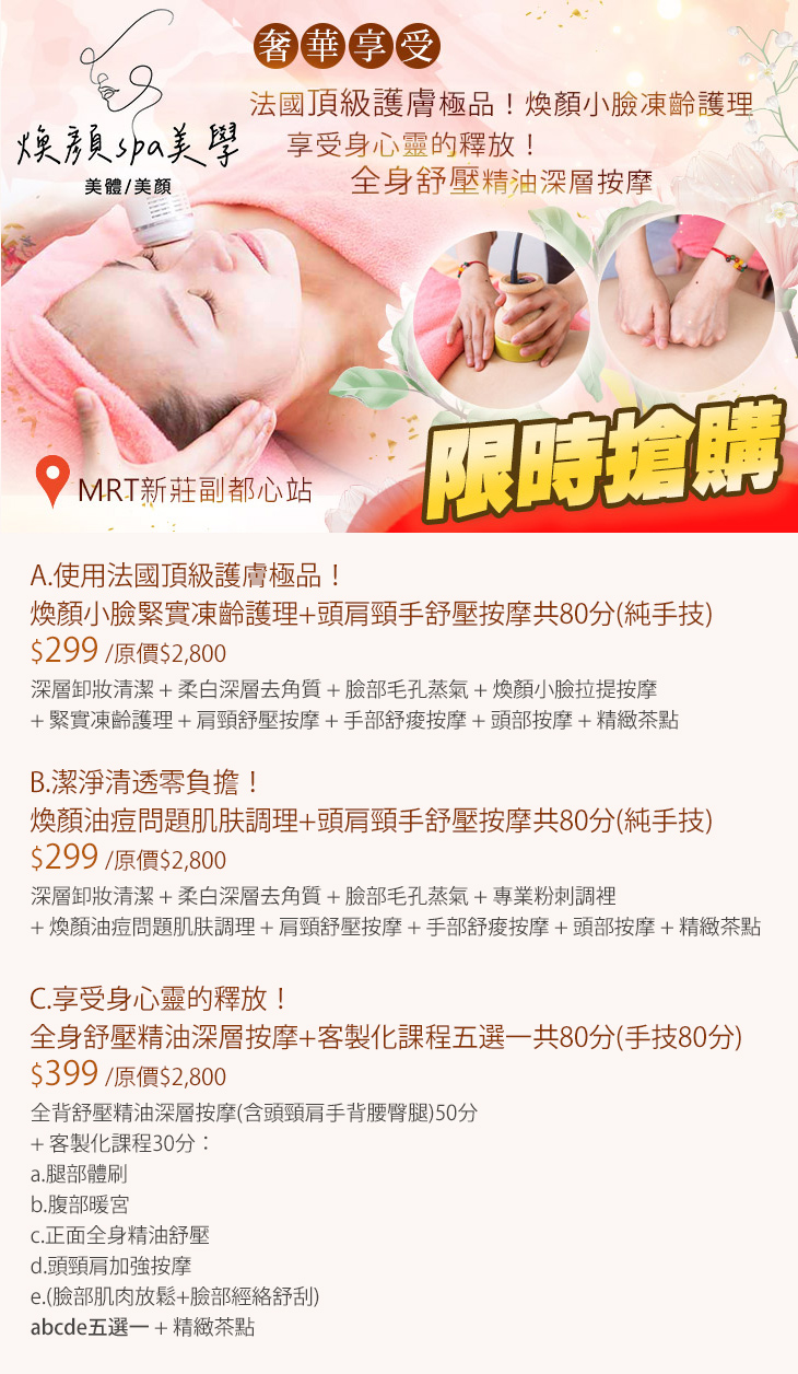 A.使用法國頂級護膚極品!煥顏小臉緊實凍齡護理+頭肩頸手舒壓按摩共80分(純手技) / B.潔淨清透零負擔!煥顏油痘問題肌肤調理+頭肩頸手舒壓按摩共80分(純手技) / C.享受身心靈的釋放!全身舒壓精油深層按摩+客製化課程五選一共80分(手技80分)
