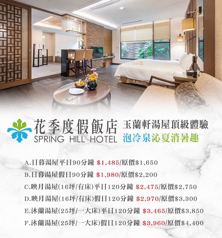 以四季主題情境氛圍設計的各式湯屋,讓您能夠享有全新的泡湯體驗;寬敞明亮的房型、柔軟舒適的床鋪,只為了提供您最頂級的休息空間!不論是情侶約會或是親子同遊都是不錯的選擇!喜歡泡湯的麻吉們可別再猶豫啦!趕緊手刀搶購吧~