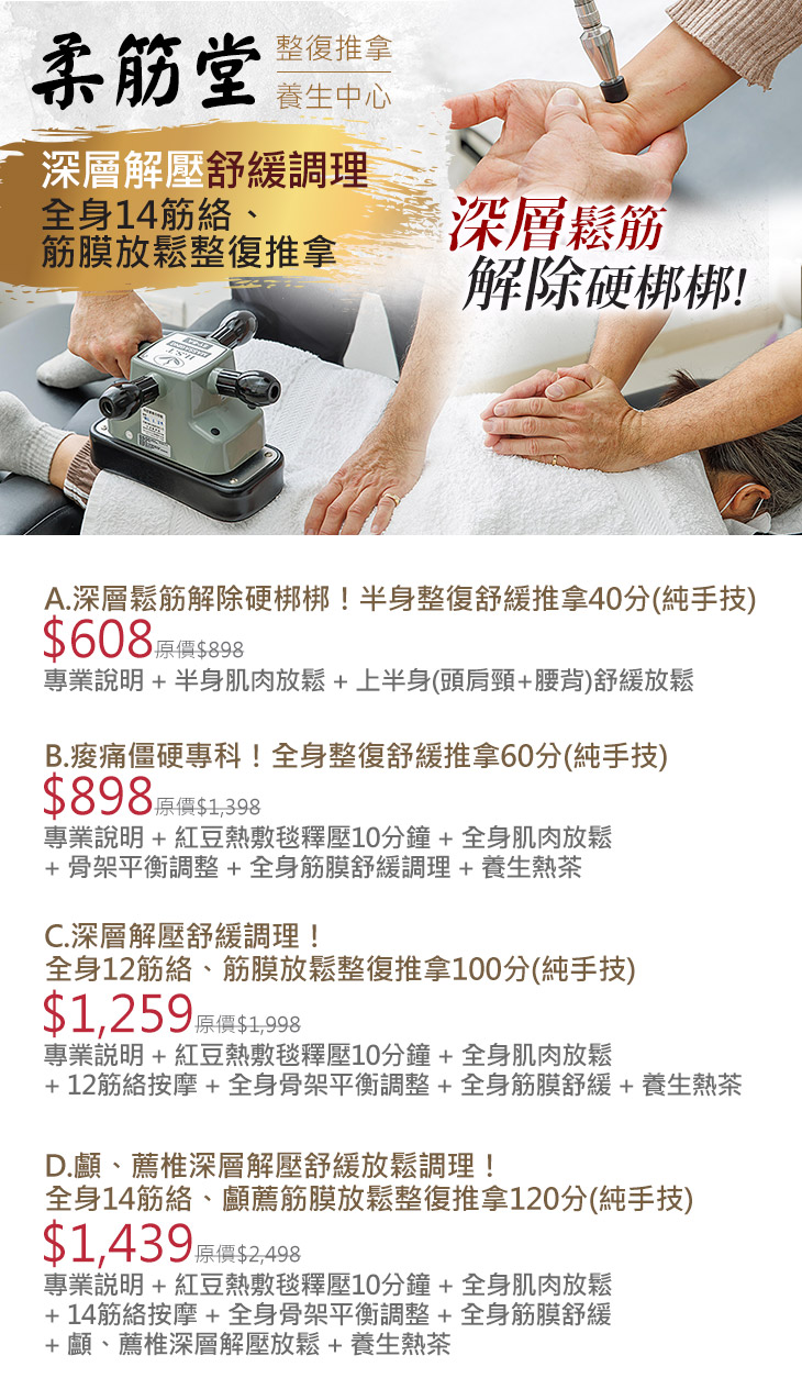 A.深層鬆筋解除硬梆梆!半身整復舒緩推拿40分(純手技) / B.痠痛僵硬專科!全身整復舒緩推拿60分(純手技) / C.深層解壓舒緩調理!全身12筋絡、筋膜放鬆整復推拿100分(純手技) / D.顱、薦椎深層解壓舒緩放鬆調理!全身14筋絡、顱薦筋膜放鬆整復推拿120分(純手技)