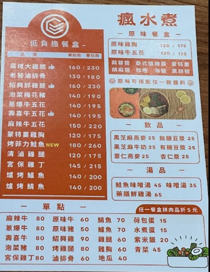 瘋水煮是一家主打健康概念的便當專賣店,以清爽調味與均衡搭配為核心,讓外食也能吃得安心無負擔。餐點強調原味呈現,不走厚重路線,吃起來清新順口卻不失風味層次。主菜口感處理得恰到好處,搭配多樣配菜,整體營養與份量都兼顧。無論是上班族午餐、健身飲控族,或想吃得清爽一點的時候,都很適合來上一份。瘋水煮把「健康」變得不無聊,讓每天的便當也能吃得有質感又有飽足感。