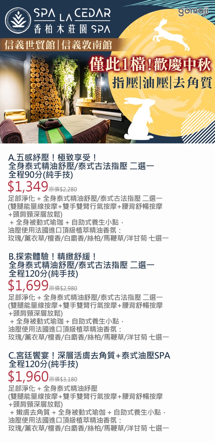 A.五感紓壓!極致享受!全身泰式精油舒壓/泰式古法指壓 二選一全程90分(純手技) / B.探索體驗!精緻舒緩!全身泰式精油舒壓/泰式古法指壓 二選一全程120分(純手技) / C.宮廷饗宴!深層活膚去角質+泰式油壓SPA全程120分(純手技)