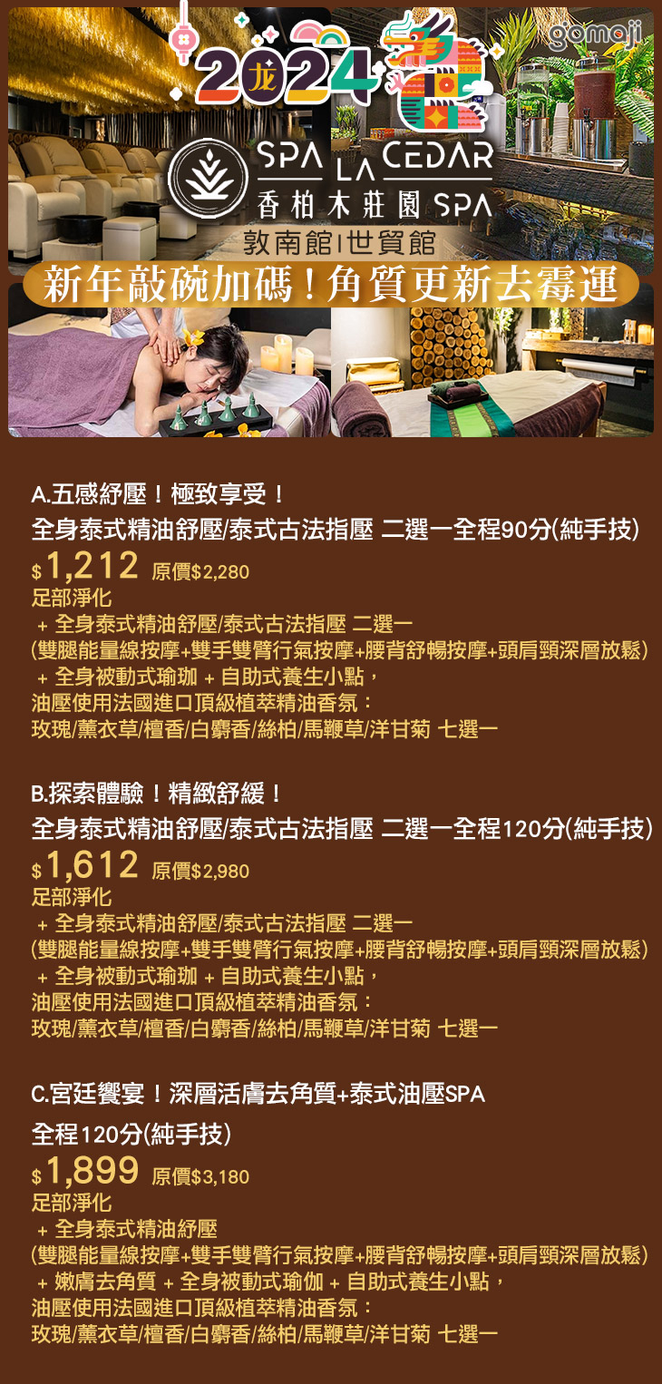 A.五感紓壓!極致享受!全身泰式精油舒壓/泰式古法指壓 二選一全程90分(純手技) / B.探索體驗!精緻舒緩!全身泰式精油舒壓/泰式古法指壓 二選一全程120分(純手技) / C.宮廷饗宴!深層活膚去角質+泰式油壓SPA全程120分(純手技)