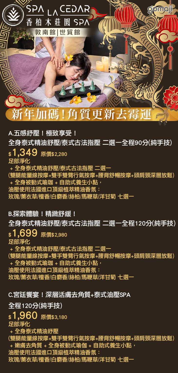 A.五感紓壓!極致享受!全身泰式精油舒壓/泰式古法指壓 二選一全程90分(純手技) / B.探索體驗!精緻舒緩!全身泰式精油舒壓/泰式古法指壓 二選一全程120分(純手技) / C.宮廷饗宴!深層活膚去角質+泰式油壓SPA全程120分(純手技)