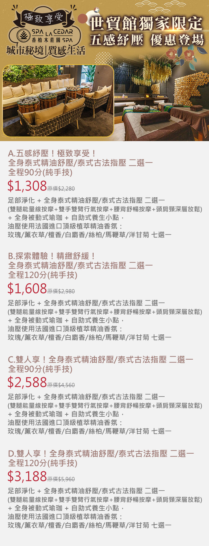 A.五感紓壓!極致享受!全身泰式精油舒壓/泰式古法指壓 二選一全程90分(純手技) / B.探索體驗!精緻舒緩!全身泰式精油舒壓/泰式古法指壓 二選一全程120分(純手技) / C.雙人享!全身泰式精油舒壓/泰式古法指壓 二選一全程90分(純手技) / D.雙人享!全身泰式精油舒壓/泰式古法指壓 二選一全程120分(純手技)