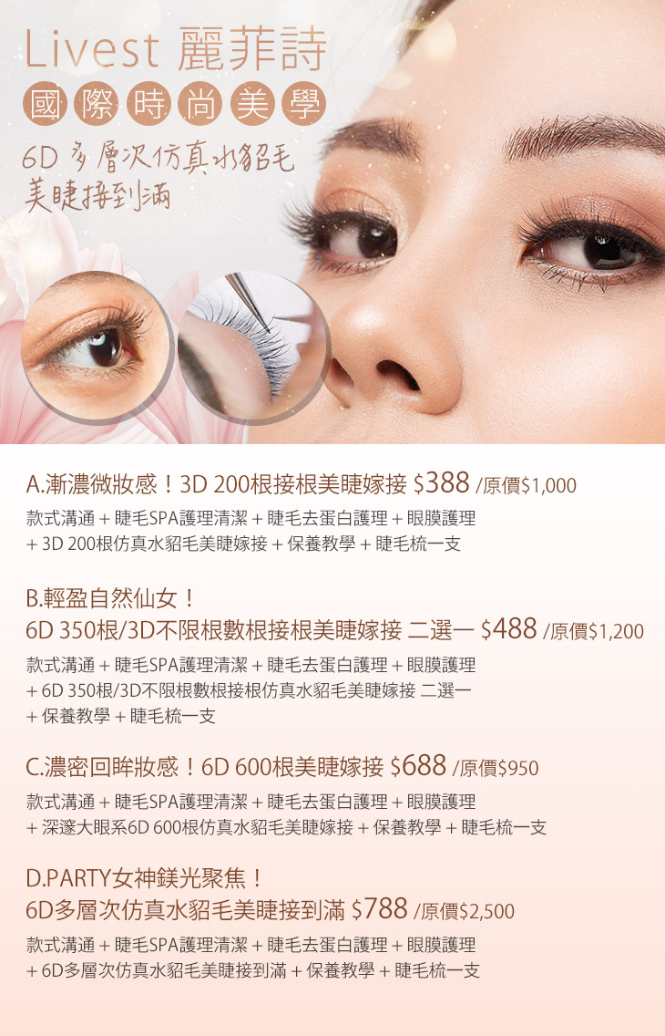 A.漸濃微妝感!3D 200根接根美睫嫁接 / B.輕盈自然仙女!6D 350根/3D不限根數根接根美睫嫁接 二選一 / C.濃密回眸妝感!6D 600根美睫嫁接 / D.PARTY女神鎂光聚焦!6D多層次仿真水貂毛美睫接到滿