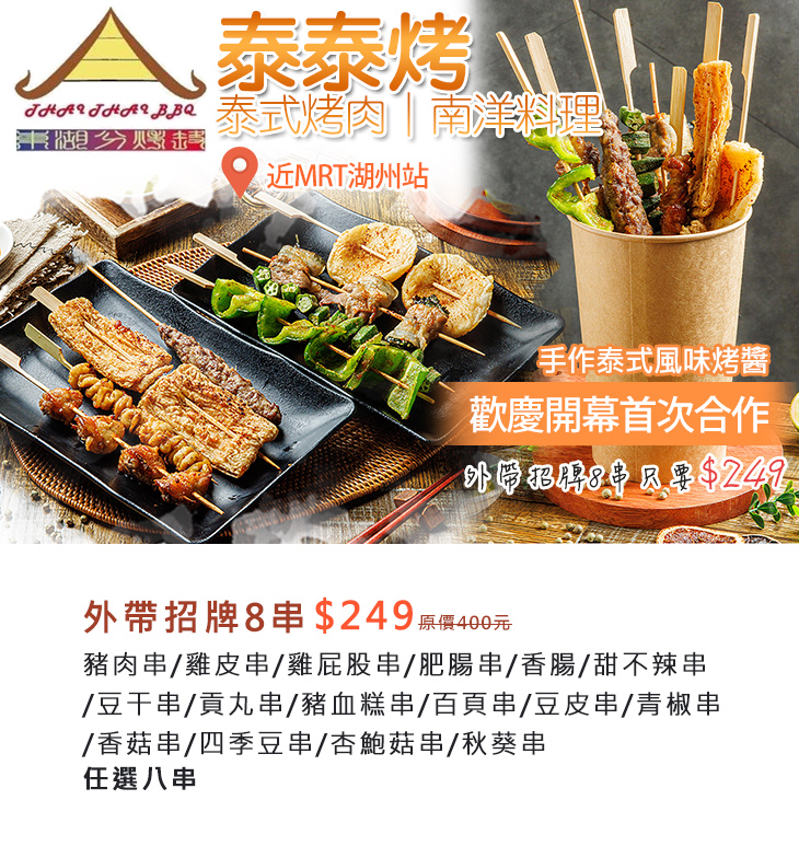 近MRT葫洲站,異國香四溢的【泰泰烤-泰式烤肉|南洋料理】,顧名思義,主打口味獨到的泰式烤肉及南洋料理,豐富的菜單選擇、精湛的廚藝展現及手作的泰式燒烤醬,處處細節皆盡善盡美,讓您品味濃厚且難忘的南國美味。
