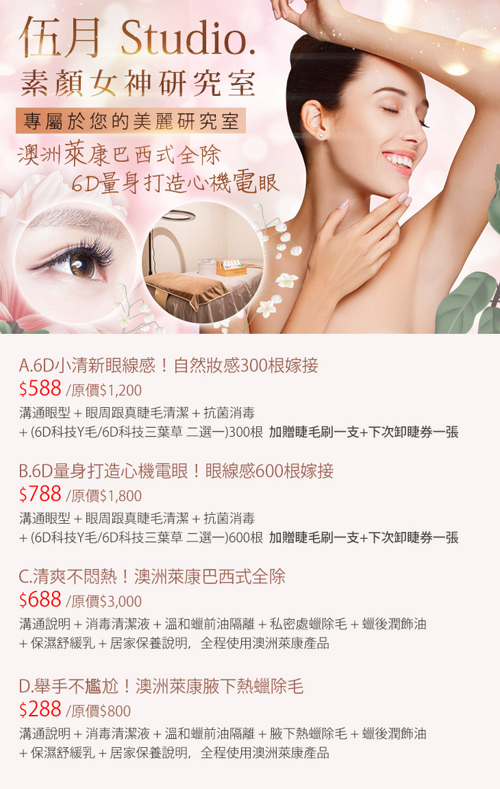 A.6D小清新眼線感!自然妝感300根嫁接 / B.6D量身打造心機電眼!眼線感600根嫁接 / C.清爽不悶熱!澳洲萊康巴西式全除 / D.舉手不尷尬!澳洲萊康腋下熱蠟除毛