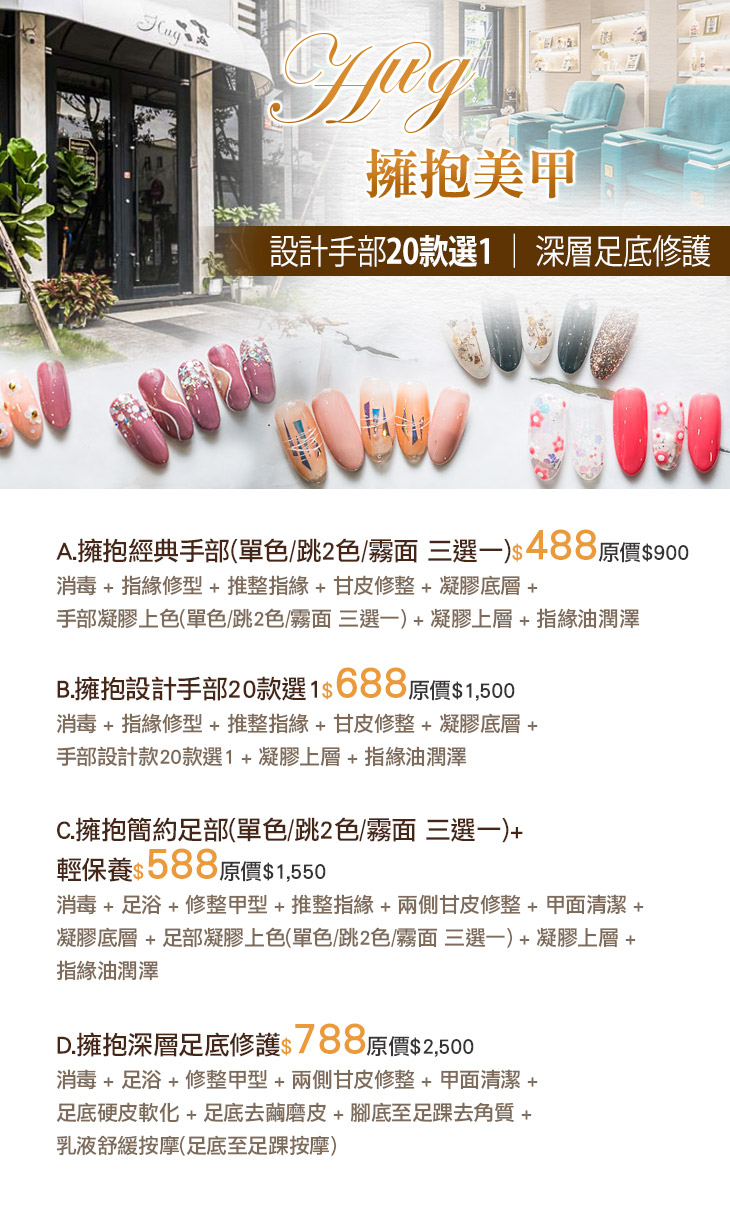 A.擁抱經典手部(單色/跳2色/霧面 三選一) / B.擁抱設計手部20款選1 / C.擁抱簡約足部(單色/跳2色/霧面 三選一)+輕保養 / D.擁抱深層足底修護
