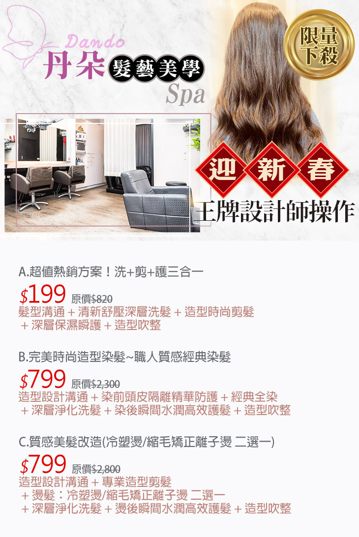 A.超值熱銷方案!洗+剪+護三合一 / B.完美時尚造型染髮~職人質感經典染髮 / C.質感美髮改造(冷塑燙/縮毛矯正離子燙 二選一)