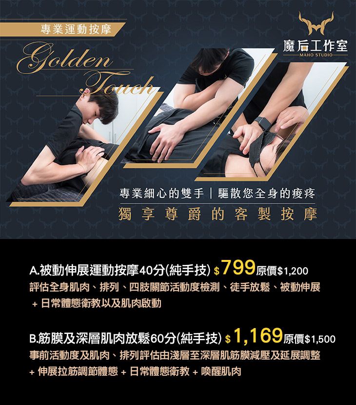 〈事前活動度及肌肉、排列評估由淺層至深層肌筋膜減壓及延展調整 + 伸展拉筋調節體態 + 日常體態衛教 + 喚醒肌肉〉