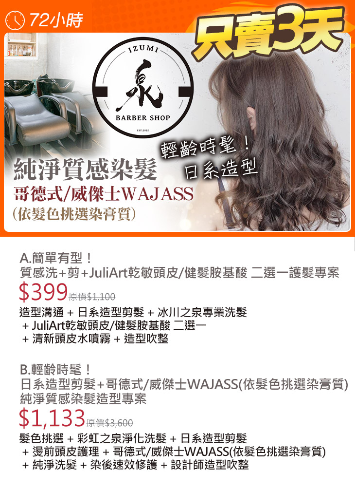 A.簡單有型!質感洗+剪+JuliArt乾敏頭皮/健髮胺基酸 二選一護髮專案 / B.輕齡時髦!日系造型剪髮+哥德式/威傑士WAJASS(依髮色挑選染膏質)純淨質感染髮造型專案