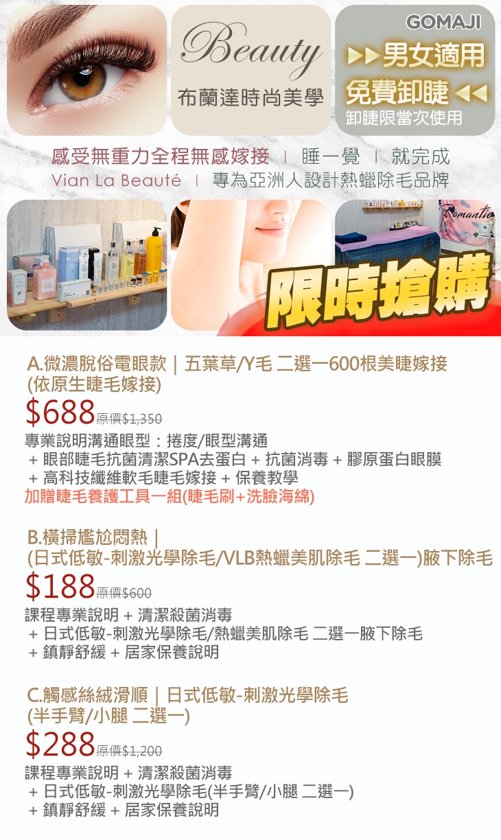 A.微濃脫俗電眼款|五葉草/Y毛 二選一600根美睫嫁接(依原生睫毛嫁接) / B.橫掃尷尬悶熱|(日式低敏-刺激光學除毛/VLB熱蠟美肌除毛 二選一)腋下除毛 / C.觸感絲絨滑順|日式低敏-刺激光學除毛(半手臂/小腿 二選一)