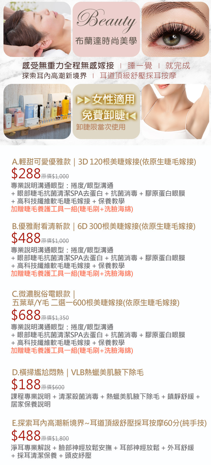 A.輕甜可愛優雅款|3D 120根美睫嫁接(依原生睫毛嫁接) / B.優雅耐看清新款|6D 300根美睫嫁接(依原生睫毛嫁接) / C.微濃脫俗電眼款|五葉草/Y毛 二選一600根美睫嫁接(依原生睫毛嫁接) / D.橫掃尷尬悶熱|VLB熱蠟美肌腋下除毛 / E.探索耳內高潮新境界~耳道頂級舒壓採耳按摩60分(純手技)